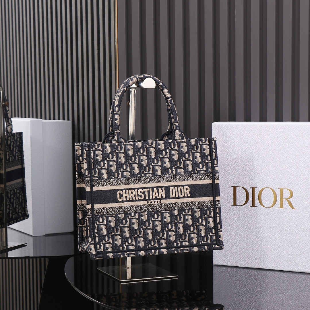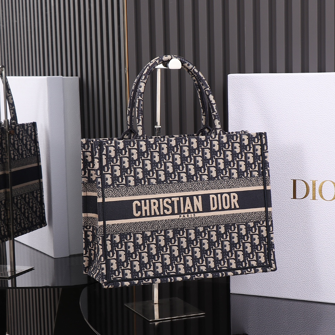 medium D*or book tote ecru and blue D*or oblique embroidery 14 x 11 x 6.5 inches