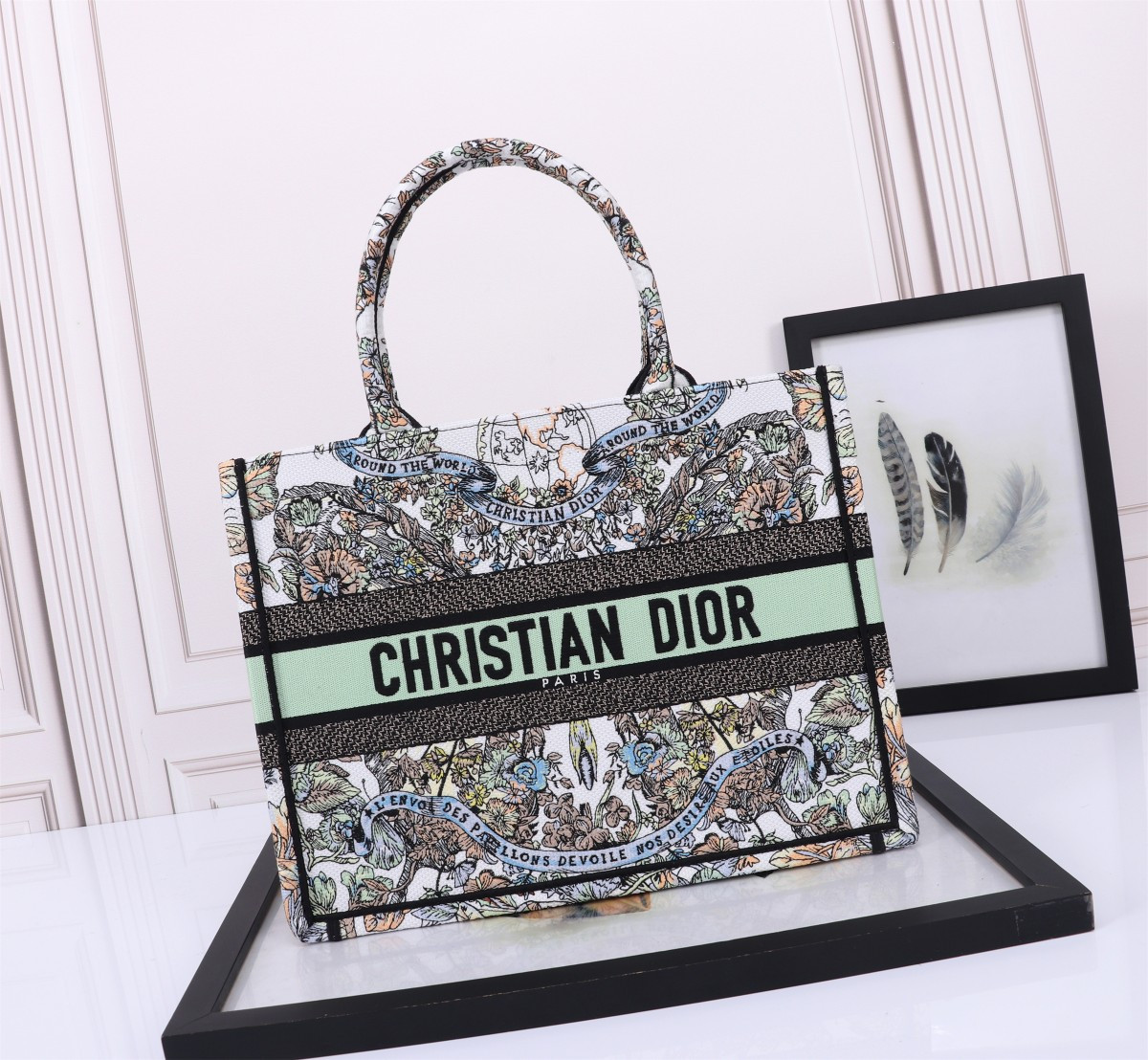 medium D*or book tote white and pastel pink butterfly around the world embroidery 14 x 11 x 6.5 inches
