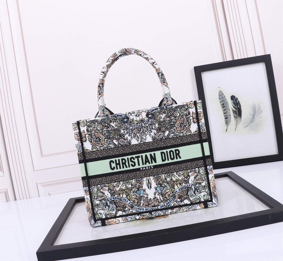 medium D*or book tote white multicolor toile de jouy mexico embroidery 14 x 11 x 6.5 inches
